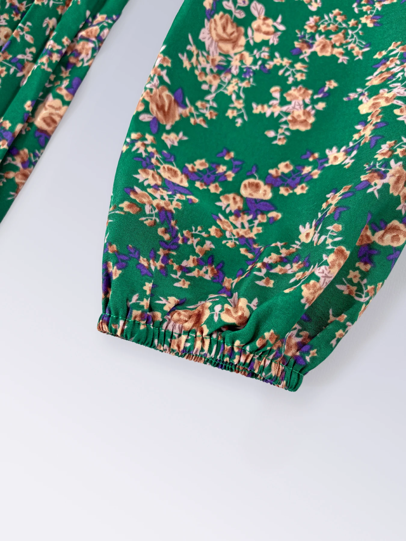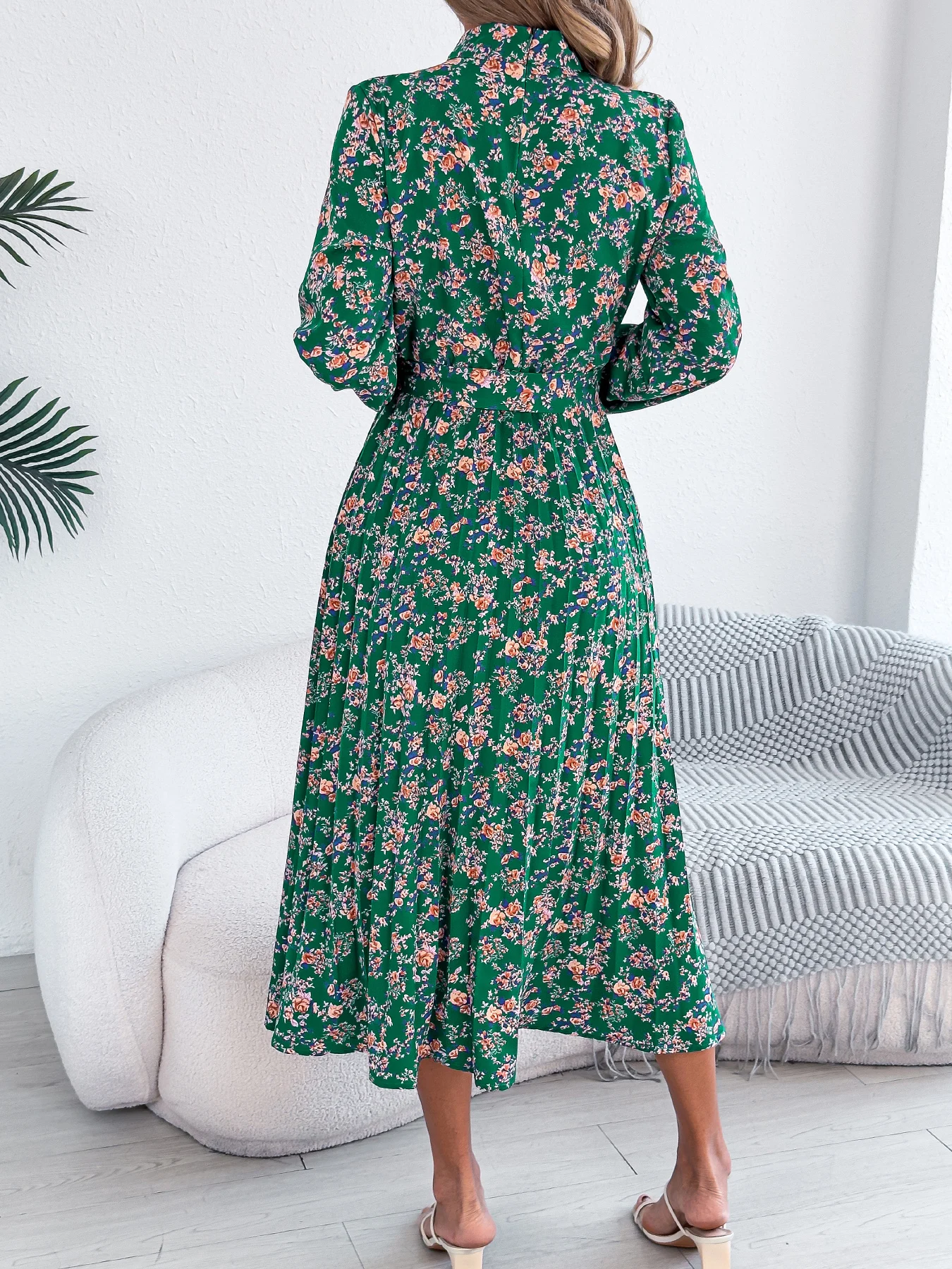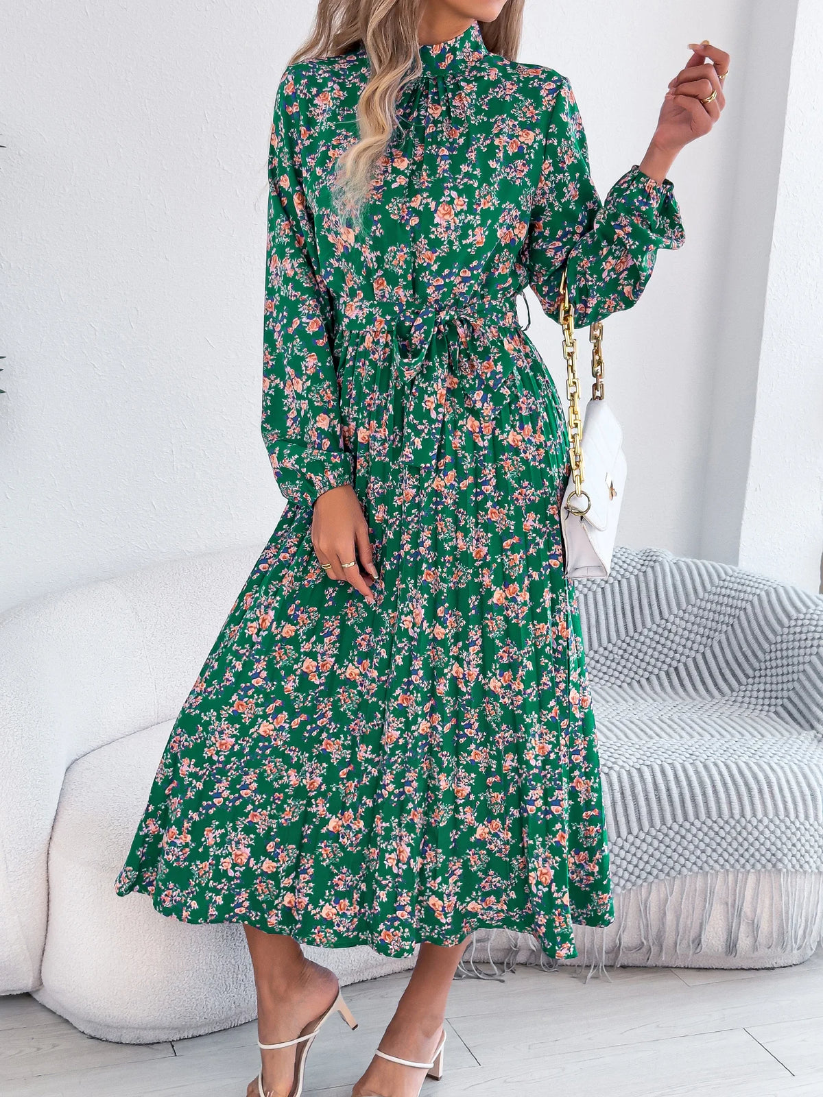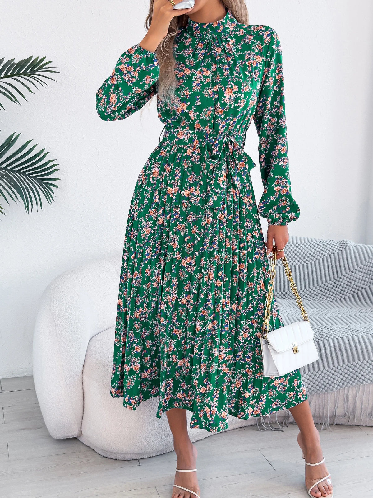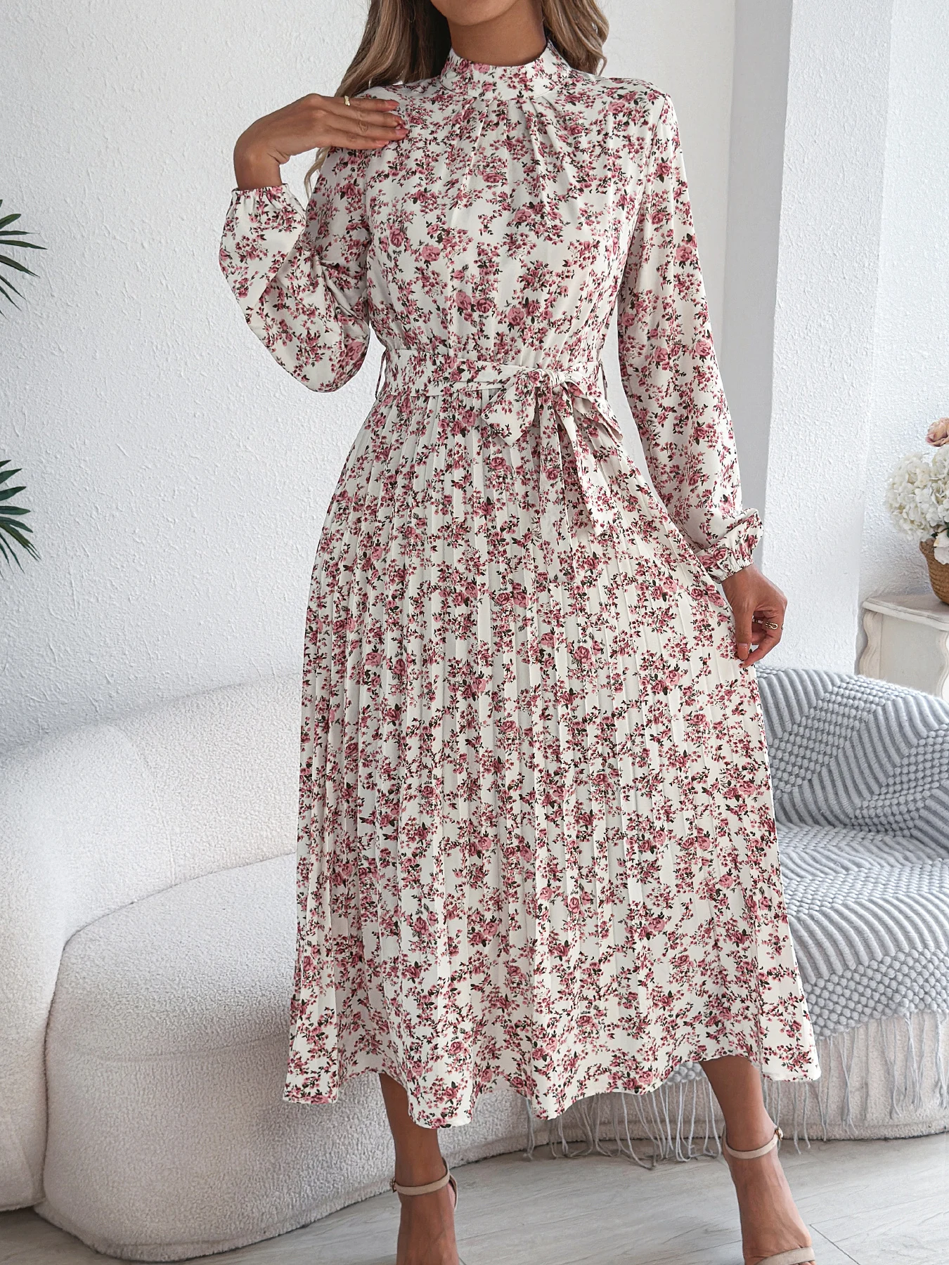 Floral Stand Up Collar Bridesmaid Dress Spring Summer Casual Elegant Long Sleeve Waist Cinched Pleated Long Dresses for Women