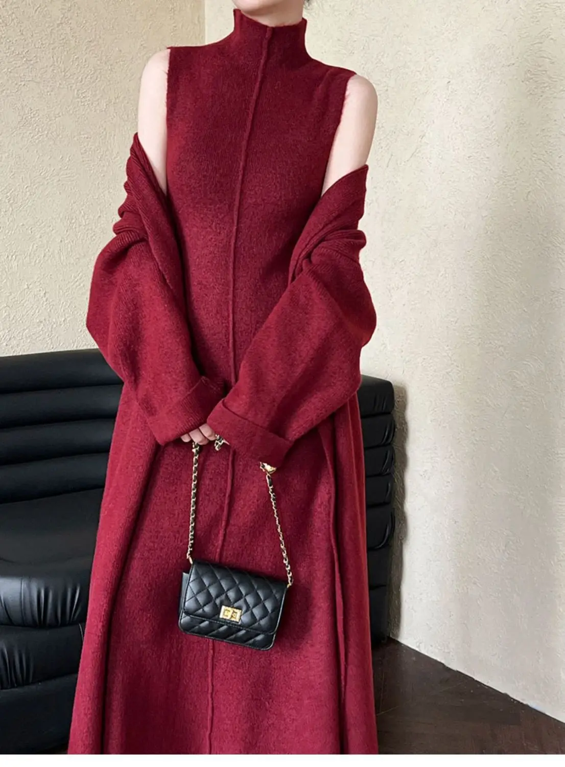 Knitted Cardigan Sleeveless Turtleneck Dress Two-Piece Set for Women Autumn Winter New Warm Mid-Length Sweater Coat Set