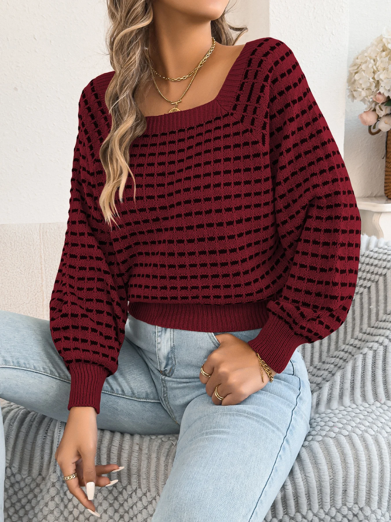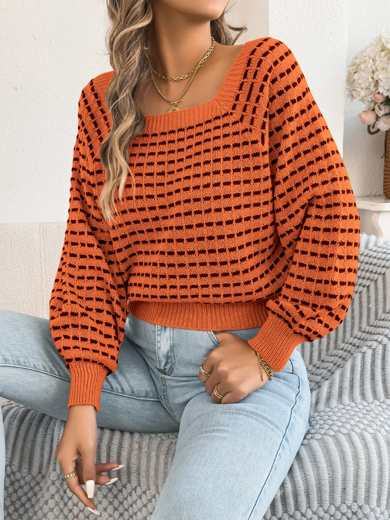 Women's Contrast Color Plaid Striped Sweaters 2025 Autumn Winter Casual Square Neck Lantern Long Sleeve Knitted Tops Orange Red