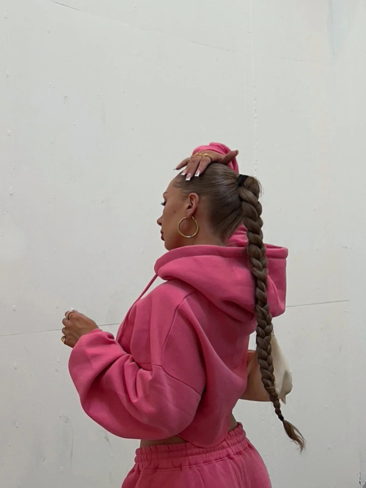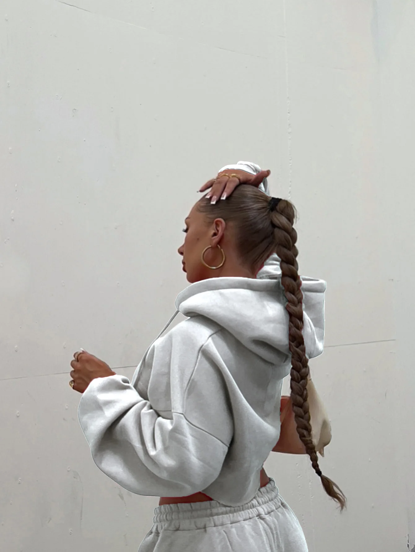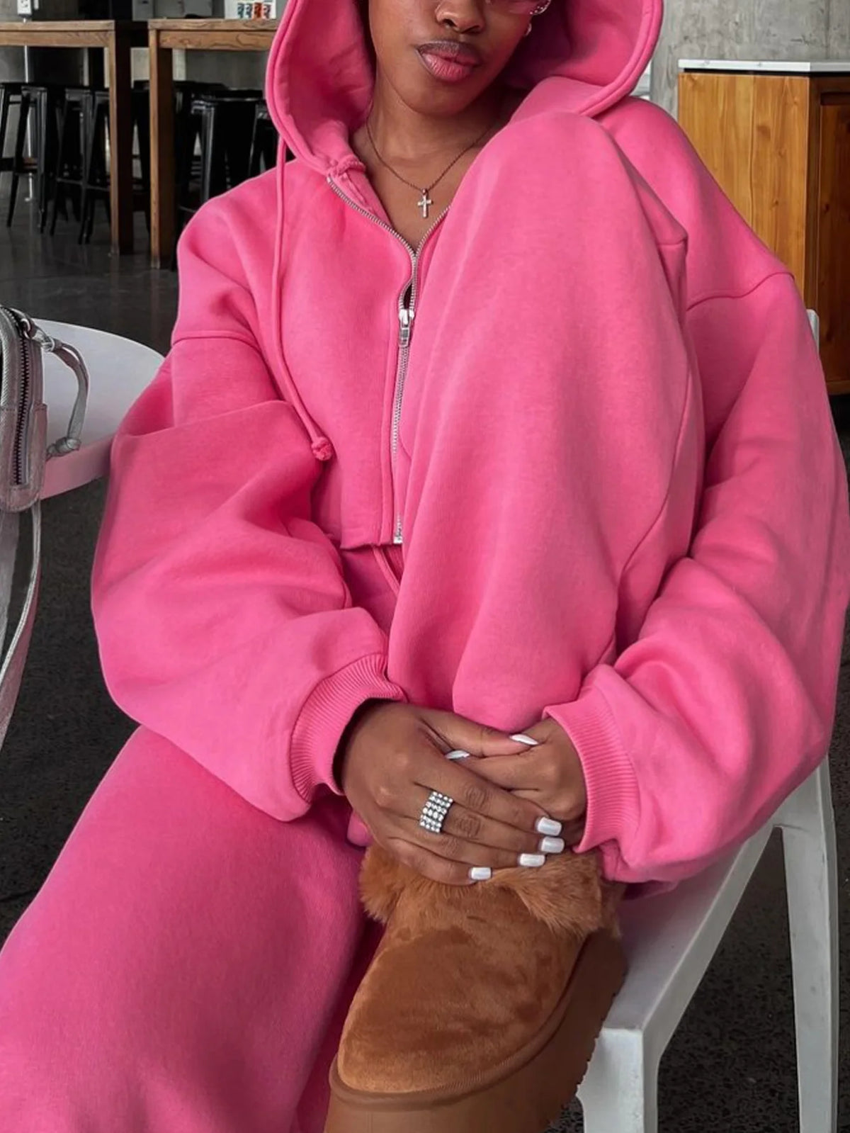Featuring a solid color with a zip-up hoodie and drawstring waist sweatpants, this set exudes a casual yet stylish vibe.