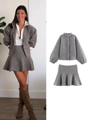 TFMLN Women's Knitted Mini Skirt Set Long Sleeve Loose Bomber Jacket Top A-Line Short Skirt Autumn Winter New Elegant Suit
